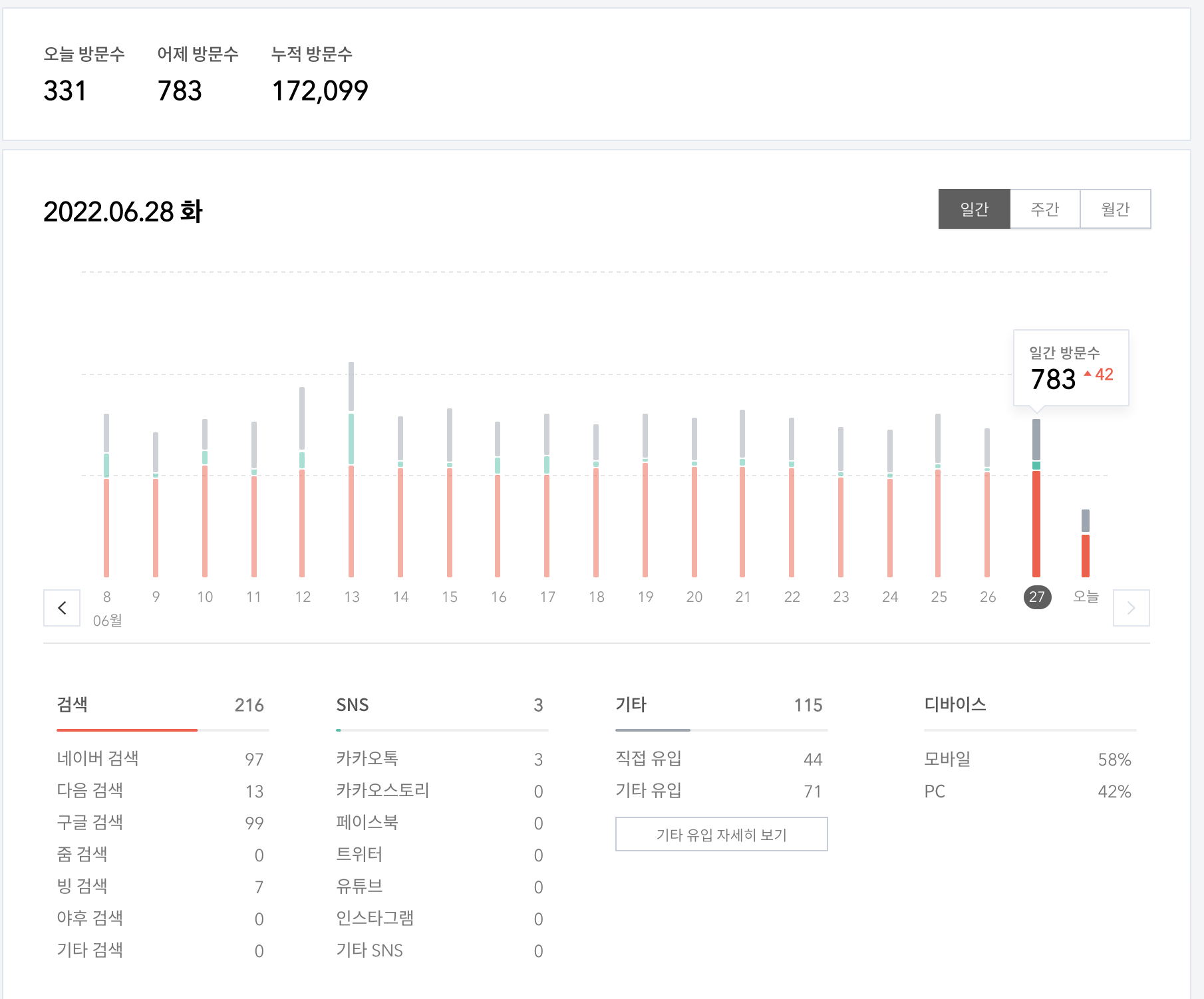 1년 3개월 간의 노력이 첫 발걸음의 방향때문에 허사가 된 느낌이 많이 들기도 하지만... 글을 작성하고 꾸준히 운영을 하는 것을 배웠다고 생각하면 그리 나쁘지만은 않습니다. 아니 사실 좀 쓴 맛이네요...